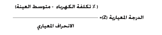 ٩-١-٣ في حالة كان هناك ثلاثة مستهلكين أو أكثر للنشاط نفسه، فيتم إجراء عملية التدقيق على البيانات المالية للحاصلين على درجة معيارية (Z) أعلى من (١). ويتم حساب الدرجة المعيارية (Z) لكل مستهلك من خلال حساب الفرق بين نسبة تكلفة الكهرباء لمنشأته من التكاليف التشغيلية لها (من دون المواد الخام) وبين متوسط تلك النسبة لكامل المستهلكين في النشاط نفسه، إلى قيمة الانحراف المعياري لتلك النسبة للمستهلكين، وذلك حسب المعادلة الإحصائية أدناه: